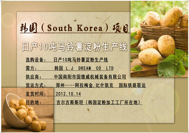 2012年8月13日雙方確定合作意向,簽訂合同,購買產品線---日產10噸馬鈴薯淀粉生產線。并明確規定由中國固德威公司提供淀粉工廠設計圖紙、設備連接圖紙、安裝技術工人等服務項目。